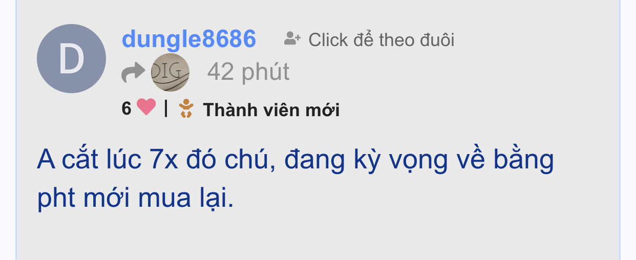 Bây giờ nó ko bán thôi, chứ lúc nào nó bán thì nó đíu nói…khi nó bán xong báo đăng thì ae mới biết…chít chỉ chít ai vào sau mua giá cao chứ hội ôm hàng từ 1x, 2x , 3x thì sao chít đk chúng nó ối ôi đợi về giá đấy thì múc cũng đk cho nó vui