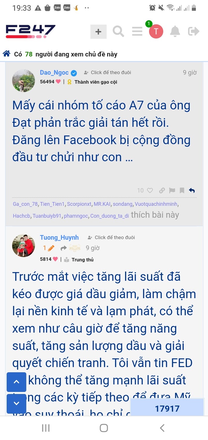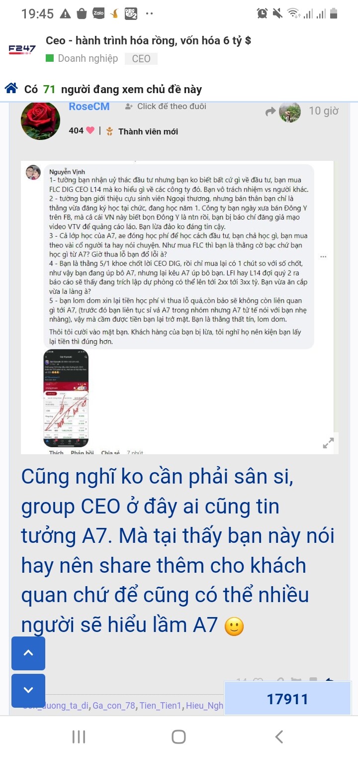 Lên đây là tôi ko có trách móc đổ lỗi cho ai cả. Tiền của tôi tôi tự chịu trách nhiệm. Tôi chỉ mong rằng A7 mãi tốt như những gì anh ấy nói. trong những lúc như thế này cần phải có sức mạnh của những người có tiếng nói như A7 để vào doanh nghiệp xem nội tại họ có vấn đề gì không tương lai sắp tới ra sao, cung cấp thông tin chính xác cho anh em yên tâm