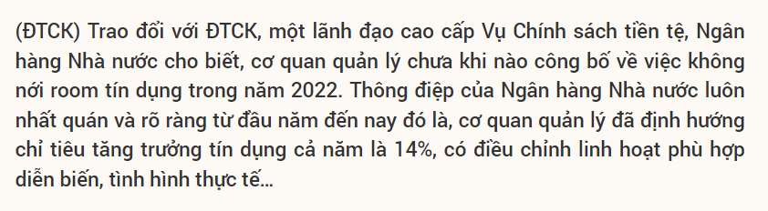 Thông tin nóng nhất vừa được Thống đốc Nguyễn Thị Hồng cho biết là Ngân hàng Nhà nước không có ý định điều chỉnh mục tiêu tăng tín dụng 14% như đã đề ra từ đầu năm nay. Tín dụng 6 tháng đầu năm 2022 đã tăng 9,35%. Đáng chú ý là tín dụng bất động sản tăng mạnh trong nửa đầu năm 2022.