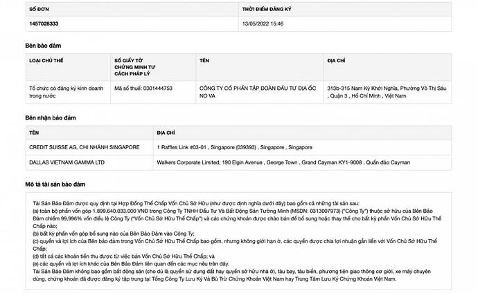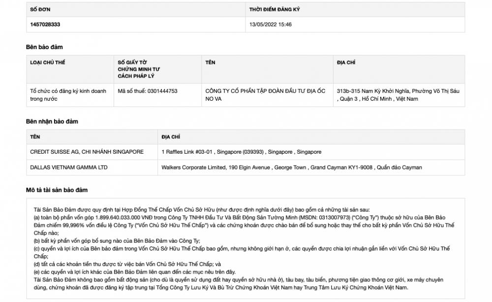 Đối với khoản vay trái phiếu số 2, gói 2, Novaland có giao dịch thỏa thuận ký tháng 5/2023 với bên nhận đảm bảo là Credit Suisse AG chi nhánh Singapore và Dallas Vietnam Gamma Ltd. Tài sản đảm bảo là giá trị phần vốn góp trị giá hơn 1.899 tỷ đồng trong Công ty TNHH Đầu tư và Bất động sản Tường Minh thuộc sở hữu của Novaland, tương ứng 99,996% vốn cổ phần của Tường Minh. Như vậy có thể hiểu Novaland cầm cố gần như toàn bộ cổ phần của Công ty Bất động sản Tường Minh cho Credit Suisse và Dallas Vietnam.