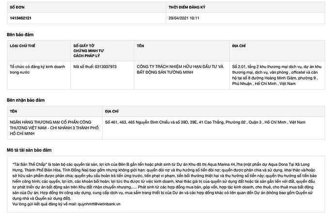 Trước đó tháng 4/2021 BĐS Tường Minh đã đưa toàn bộ quyền tài sản, lợi ích gắn liền phát sinh từ Dự án Khu đô thị Aqua Marina 44,74ha (một phần dự án Aqua Dona tại xã Long Hưng, thành phố Biên Hòa, tỉnh Đồng Nai) đi cầm cố, bên nhận cầm cố là Ngân hàng TMCP Công thương Việt Nam (Vietinbank).