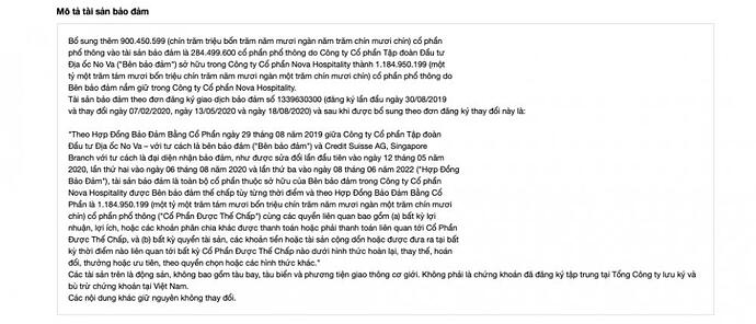 Thông tin giao dịch tài sản đảm bảo ghi nhận tháng 8/2019 Novaland có giao dịch đảm bảo, bên nhận đảm bảo là Credit Suisse và các bên hợp danh như Industrieal and Commercial Bank, Taiwam Business Bank, Union Bank of Taiwan, Taichung Commercial Bank… mà tài sản đảm bảo là cổ phần của Novaland tại Nova Hospital. Số cổ phần này nhiều lần được bổ sung. Lần bổ sung gần đây nhất tháng 6/2022 Novaland đã thêm hơn 900 triệu cổ phần tại Nova Hospital, lên tổng hơn 1,18 tỷ cổ phần phổ thông tại Nova Hospital do Novaland nắm giữ. Thời hạn vay 42 tháng, tương ứng khoản vay này sẽ đến hạn trả ngay quý 1/2023.