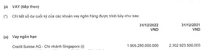 Báo cáo tài chính quý 4/2022 của Novaland ghi nhận công ty còn khoản dư nợ vay tài chính ngắn hạn hơn 1.900 tỷ đồng tại Credit Suisse AG chi nhánh Singapore. Đây là khoản vay có tổng hạn mức 251 triệu USD cho CTCP Nova Hospitality, gồm 2 khoản vay. Khoản vay bằng đô la Mỹ được thu xếp bởi Credit Suisse AS Singapore và những bên cho vay hợp vốn khác như Industrieal and Commercial Bank of China Limited, Hongkong Branch; Taichung Commercial Bank Co., Ltd; Taiwam Business Bank; Offshore Banking Branch…