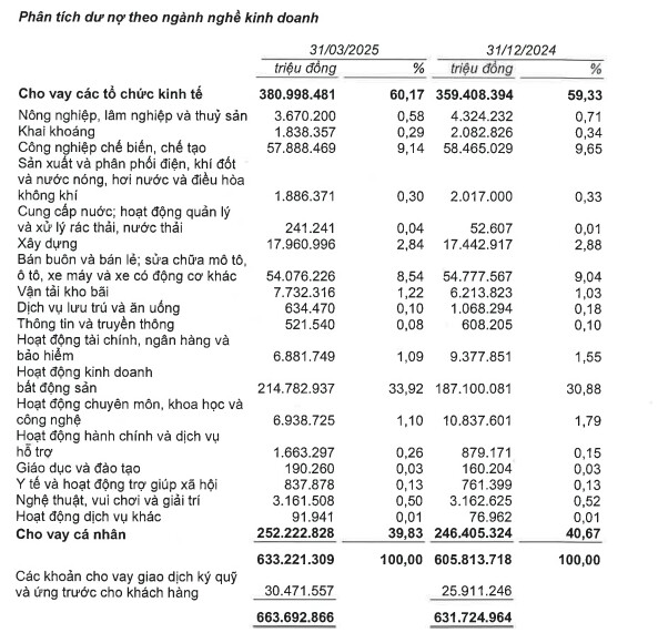 Dư nợ cho vay theo ngành của VPB ( BCTC Q1/25 ) : Cơ cấu đối tượng vay vốn Q1/2025 của VPBank khá đa dạng: Tuy nhiên tỷ trọng khá thấp, chủ yếu phân bổ ở 2 nhóm chính :