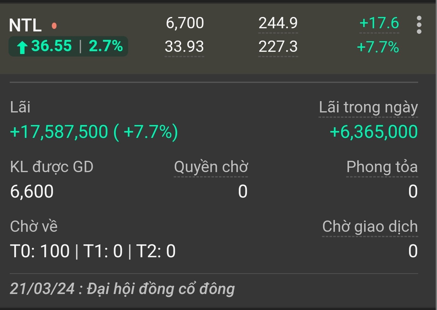 Năm 2024, trên cơ sở tiếp tục kinh doanh dự án Bãi Muối, Mirae Asset kỳ vọng NTL sẽ ghi nhận doanh thu 1.000 tỷ đồng và lợi nhuận 500 tỷ đồng. Một trong những điểm khác biệt của NTL so với phần lớn các doanh nghiệp bất động sản khác là ưu tiên chi trả cổ tức bằng tiền mặt và trong giai đoạn từ 2019 - 2023, NTL có mức chi cổ tức bình quân là 25% (2.500 đồng/cổ phiếu) bằng tiền.