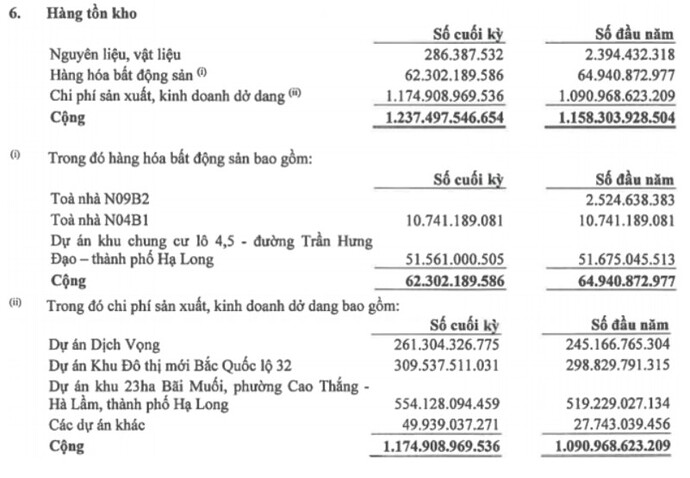 Chi tiết trong thuyết minh báo cáo tài chính mục tồn kho thì phần lớn nằm tại 3 dự án của công ty đó là dự án KĐT mới Bắc quốc lộ 32, dự án Bãi Muối và dự án Dịch Vọng. Chi tiết các dự án chúng tôi sẽ update và phân tích trong phần dưới của bài viết. Như vậy tài sản chính của công ty chính là các dự án đang triển khai giúp mang lại lợi nhuận khi bàn giao dự án cho công ty