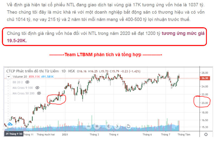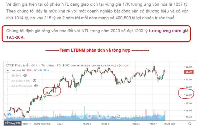 Trong bài viết này chúng tôi sẽ cập nhật báo cáo tài chính quý 2 vừa mới ra và phân tích các dự án của NTL trong năm 2021 để từ đó xem với những kỳ vọng các dự án tiếp theo thì định giá với NTL trong năm 2021 là bao nhiêu là hợp lý. Trong năm 2020 chúng tôi cũng đã có bài viết về NTL vào tháng 9 và với định giá 19.5-20K, mức giá rất sát với giá cổ phiếu ở thời điểm cuối 2020. Cụ thể như ảnh và link bài bên dưới (Hình 1) : NTL – UPDATE TÌNH HÌNH HIỆN TẠI – Chứng khoán