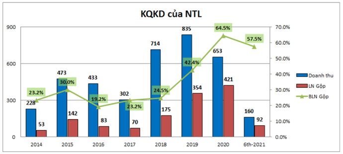 Trong các năm gần đây kết quả kinh doanh của NTL có xu hướng tăng trưởng khá tốt, nhất là bắt đầu từ giai đoạn 2018 đến nay. Năm 2020 tuy doanh thu giảm khá nhiều so với 2019 nhưng nhờ biên lợi nhuận gộp tăng mạnh đã giúp lợi nhuận gộp của công ty vẫn duy trì được đà tăng liên tục từ 2017 đến nay. Nhờ hạch toán các dự án có biên lợi nhuận gộp cao đã giúp biên lợi nhuận gộp của công ty tăng mạnh từ