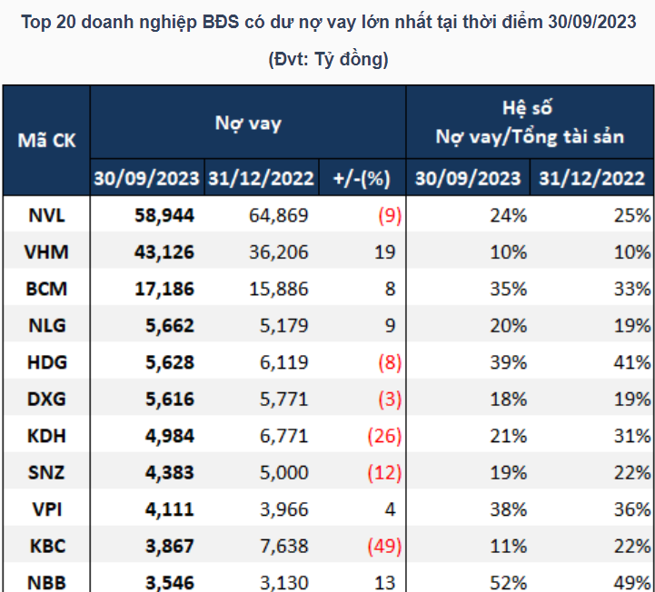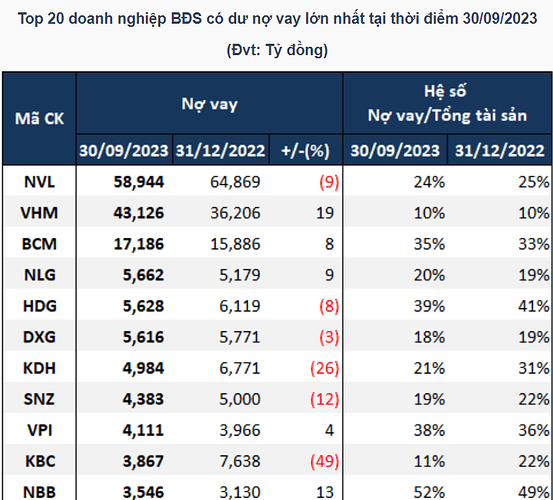 - Nợ vay của NVL giảm sau 9 tháng đầu năm, còn gần 59 ngàn tỷ đồng. Trong đó, vay ngân hàng hơn 9 ngàn tỷ đồng (chiếm hơn 15%), nợ trái phiếu hơn 40 ngàn tỷ đồng (hơn 68%), còn lại là vay bên liên quan hoặc bên thứ ba.