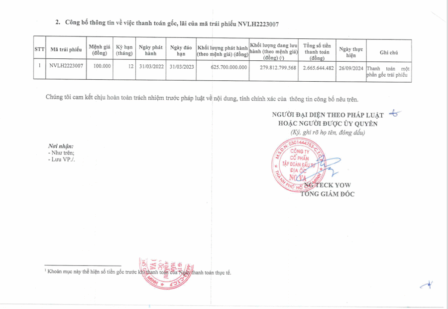 CTCP Tập đoàn Đầu tư Địa ốc NoVa - Novaland (mã NVL-HOSE) công bố thông tin bất thường về việc thanh toán gốc, lãi của 2 lô trái phiếu NVLH2223007 và NVLH2223008.