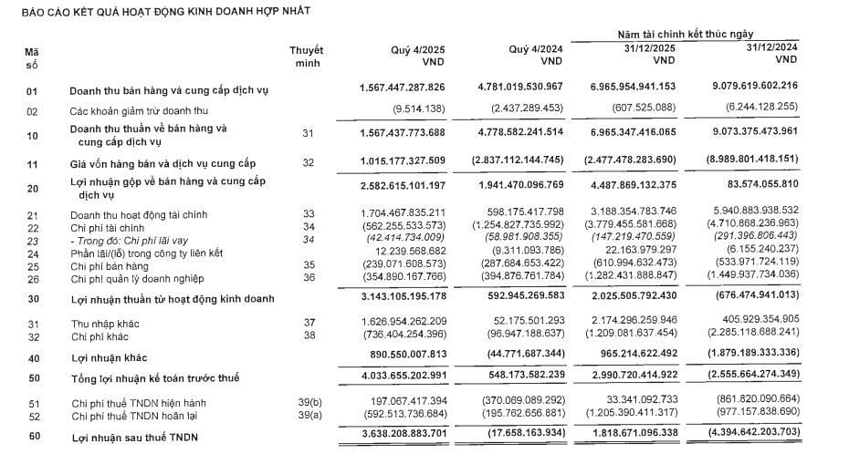 Kết quả: Lợi nhuận sau thuế cty mẹ Quý 4/2025 đạt 3182 tỷ (cùng kì -2350 tỷ). Chính thức có lãi năm 2025 1700 tỷ so với lỗ 6455 tỷ.