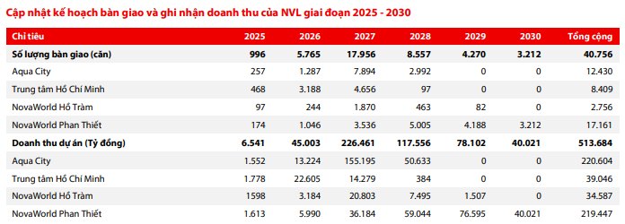 Năm 2027 và 2028 sẽ là điểm rơi quan trọng trong kế hoạch tăng trưởng của công ty. Trong năm 2027, tổng số sản phẩm bàn giao dự kiến đạt 17.956 căn, đặc biệt là sự đóng góp từ các dự án như Aqua City và NovaWorld Hồ Tràm. Điều này sẽ kéo theo mức doanh thu dự kiến đạt 226.461 tỷ đồng. Tiếp theo, năm 2028, NVL tiếp tục đẩy mạnh bàn giao với 8.557 căn, trong đó các dự án trọng điểm như Aqua City và NovaWorld Phan Thiết đóng góp đáng kể; qua đó NVL dự báo doanh thu sẽ đạt 117.556 tỷ đồng.