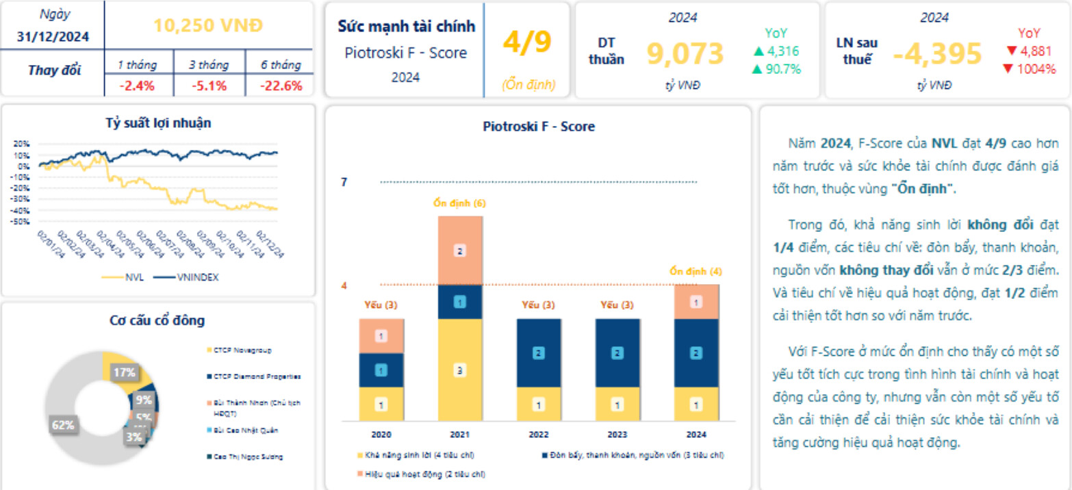 - Xét các tiêu chí thành phần của F-Score năm 2024 của NVL: Dấu hiệu tiêu cực khi lợi nhuận sau thuế và dòng tiền thuần từ hoạt động kinh doanh âm, cho thấy công ty đang