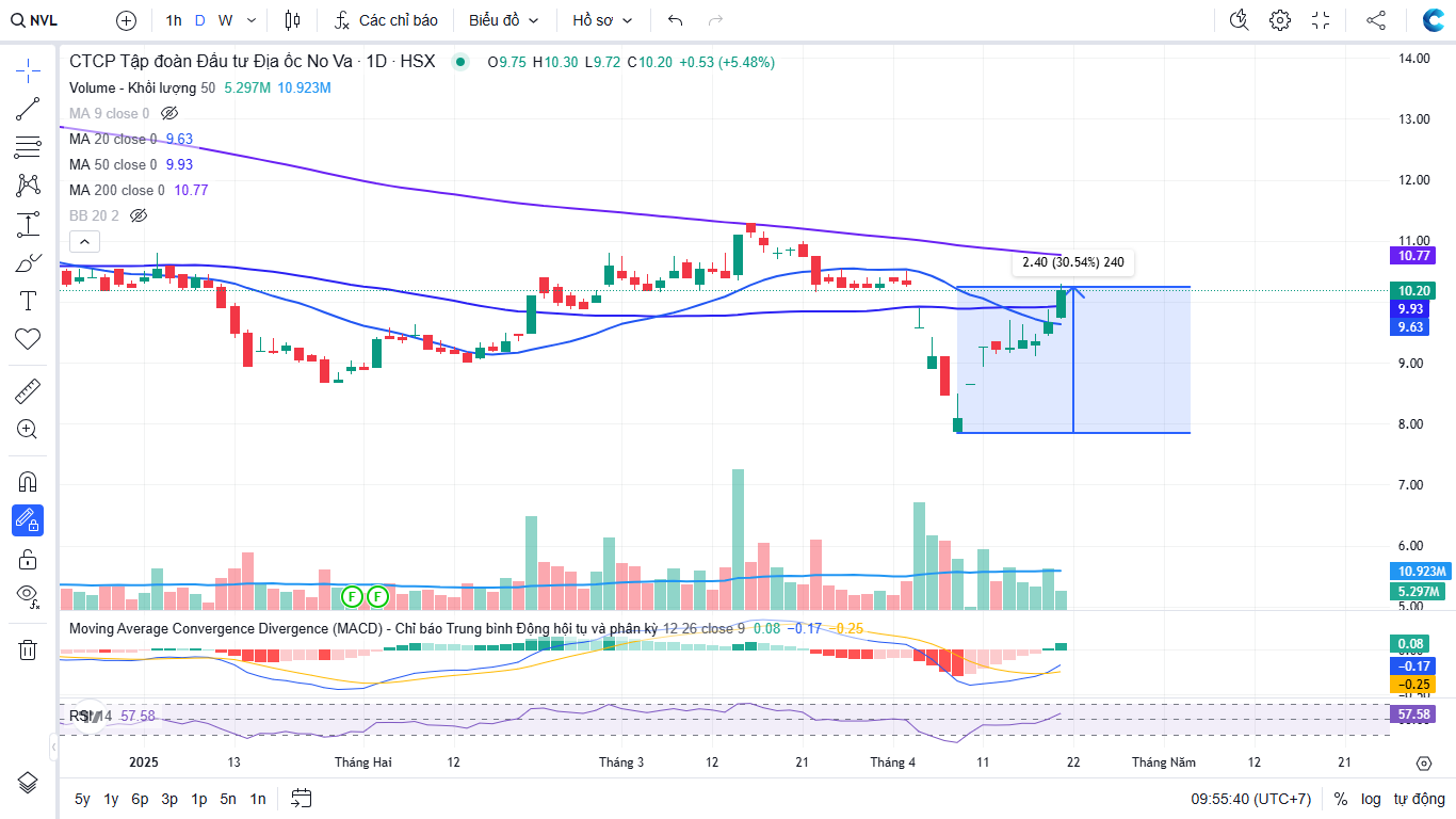 Đầu tiên phải biết rằng ở nhịp rơi vừa rồi NVL đã về vùng đáy lịch sử của cổ phiếu cho những tác động từ tin tức thuế quan, mặc cho cùng giai đoạn đó NVL đang có những thông tin tích cực được đưa ra liên tục. Đặc biệt là ngày 3/4 NVL đã được đưa ra khỏi diện cảnh báo do chậm BCTC trước đó.