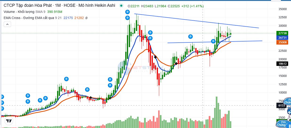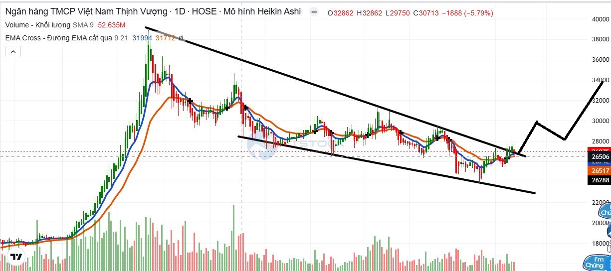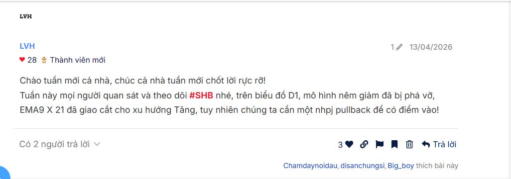 Tuần này mọi người quan sát và theo dõi #SHB nhé, trên biểu đồ D1, mô hình nêm giảm đã bị phá vỡ, EMA9 X 21 đã giao cắt cho xu hướng Tăng, tuy nhiên chúng ta cần một nhpj pullback để có điểm vào!