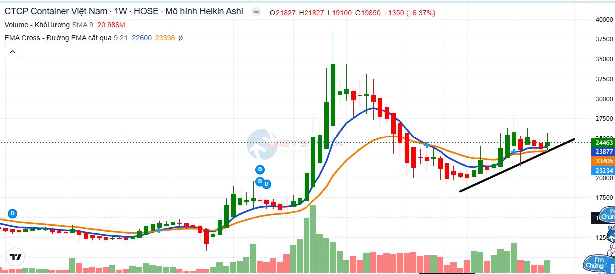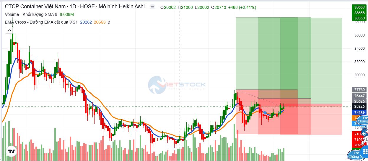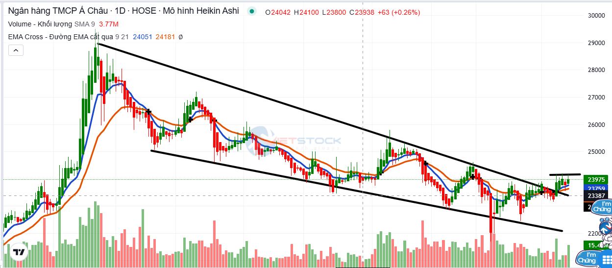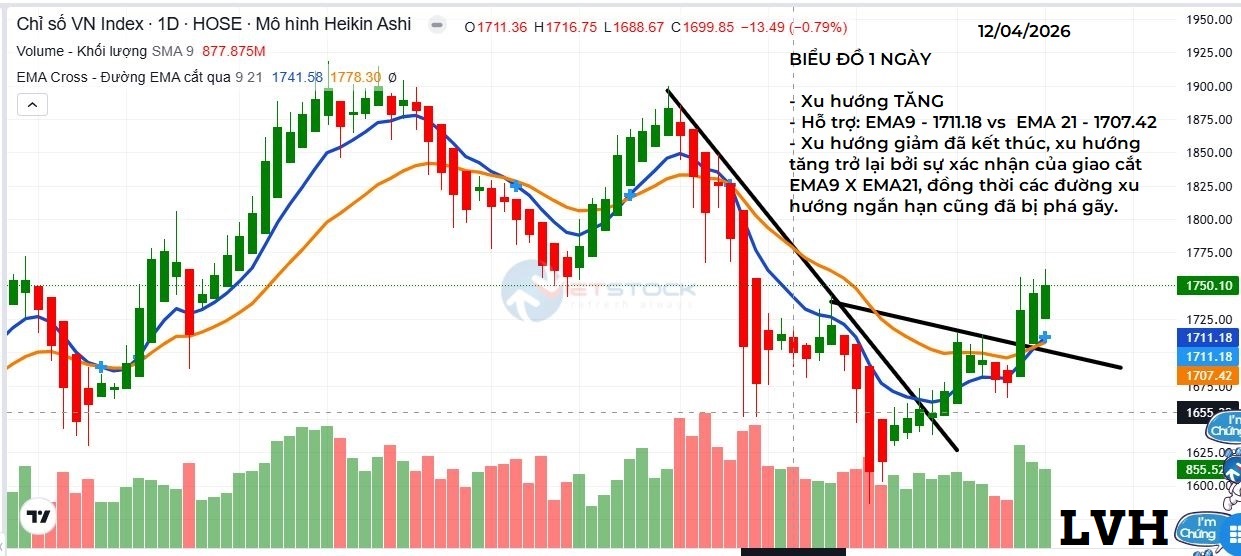 Xu hướng giảm đã kết thúc, xu hướng tăng trở lại bởi sự xác nhận của giao cắt EMA9 X EMA21, đồng thời các đường xu hướng giảm dài, ngắn hạn cũng đã bị phá gãy.