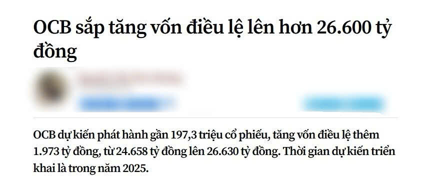 OCB vừa được Ngân hàng Nhà nước chấp thuận tăng vốn điều lệ thêm 1.972 tỷ đồng, nâng tổng vốn lên gần 26.600 tỷ. Việc tăng vốn thông qua phát hành cổ phiếu cho cổ đông hiện hữu sẽ giúp ngân hàng mở rộng hạn mức tín dụng, đảm bảo hệ số an toàn vốn CAR duy trì trên ngưỡng 13%.