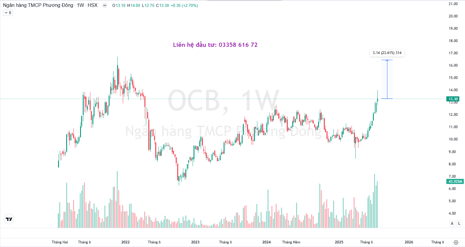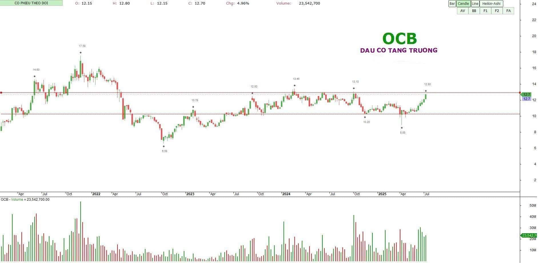 Cổ phiếu OCB đã có hơn 6 tháng dao động tích lũy trong vùng 11.8–12.2, tạo nền giá chắc chắn trước khi bước vào chu kỳ tăng mới. Phiên ngày 1/7/2025 ghi nhận tín hiệu break nền với khối lượng tăng gấp đôi bình quân, xác nhận động lực dòng tiền đầu cơ quay lại nhóm ngân hàng.