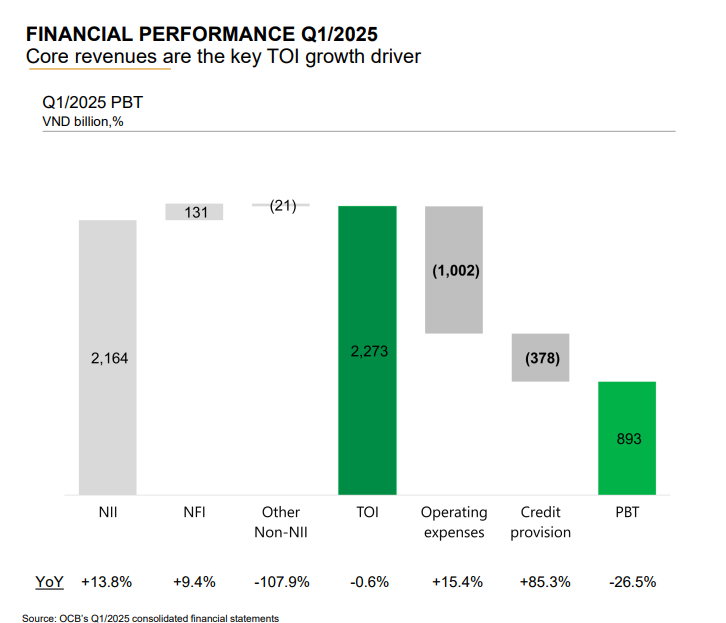 Trong quý 1/2025, OCB ghi nhận tổng thu nhập thuần đạt 2.273 tỷ đồng – tăng trưởng khoảng 3% so với cùng kỳ. Lợi nhuận trước thuế đạt gần 893 tỷ đồng, tăng nhẹ nhưng phản ánh xu hướng tích cực, nhất là khi toàn ngành đang chịu áp lực chi phí vốn, trích lập dự phòng tăng và cầu tín dụng yếu.