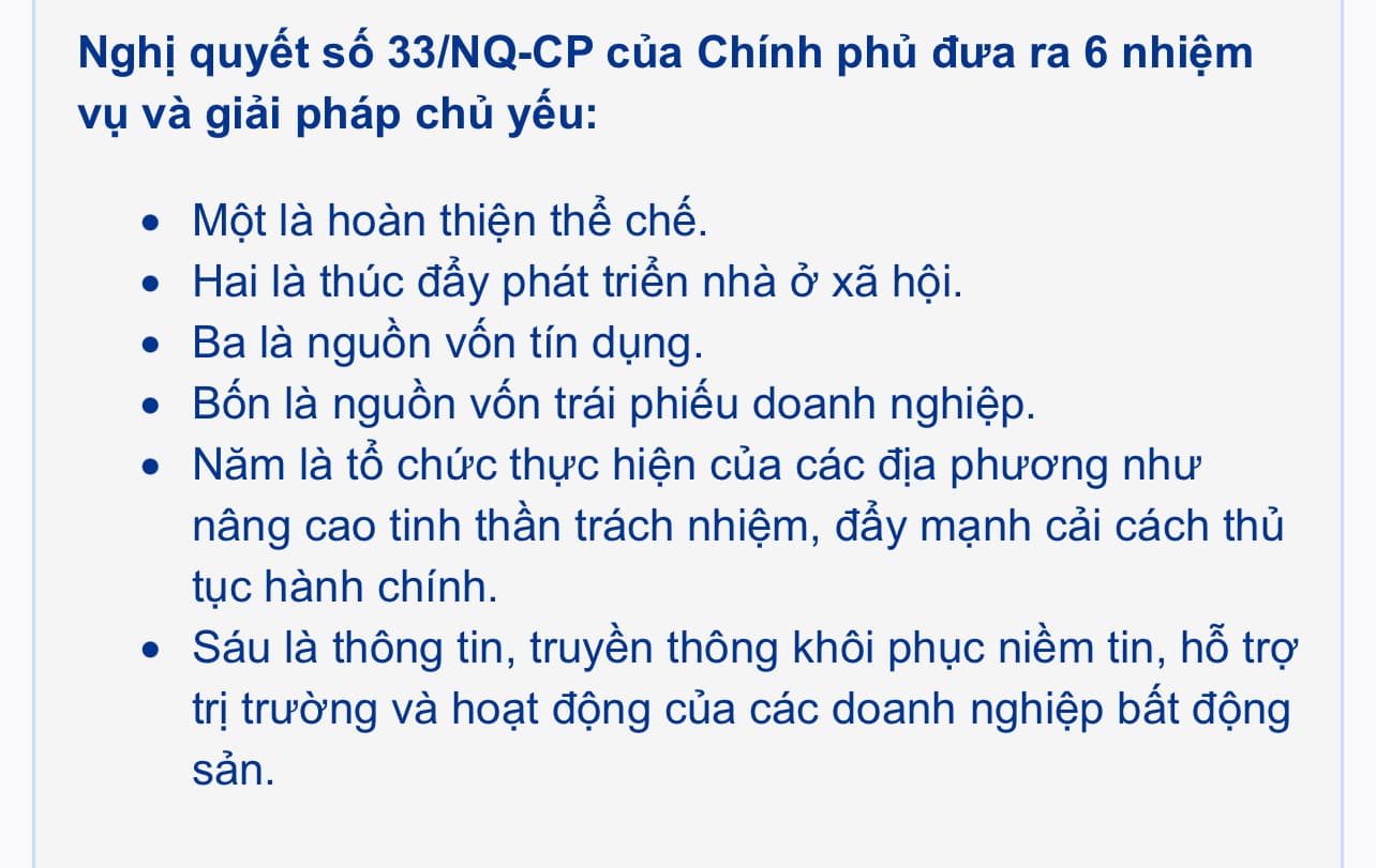 Cũng liên quan đến chính sách tín dụng, trong “Nghị quyết số 33/NQ-CP ngày 11/3/2023 về một số giải pháp tháo gỡ và thúc đẩy thị trường bất động sản phát triển an toàn, lành mạnh, bền vững”, Chính phủ sẽ tạo điều kiện cho các doanh nghiệp, người mua nhà và nhà đầu tư được nhanh chóng tiếp cận nguồn vốn tín dụng.