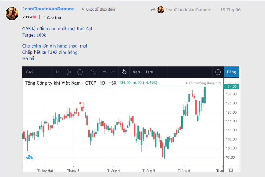 Em chưa bao giờ tin bọn t+ có bãn lãnh thắng được em trong dài hạn, giàu bằng em trong dài hạn… cho nên em gọi anh bạn này @JeanClaudeVanDamme đăng lại lời thú nhận chân thật của em vụ thị trường down vừa qua làm tài khoản em bị chia… em cám ơn vì anh giúp em càng thêm nổi tiếng trong giới đầu tư dài hạn tại xứ vit ngan này ạ !