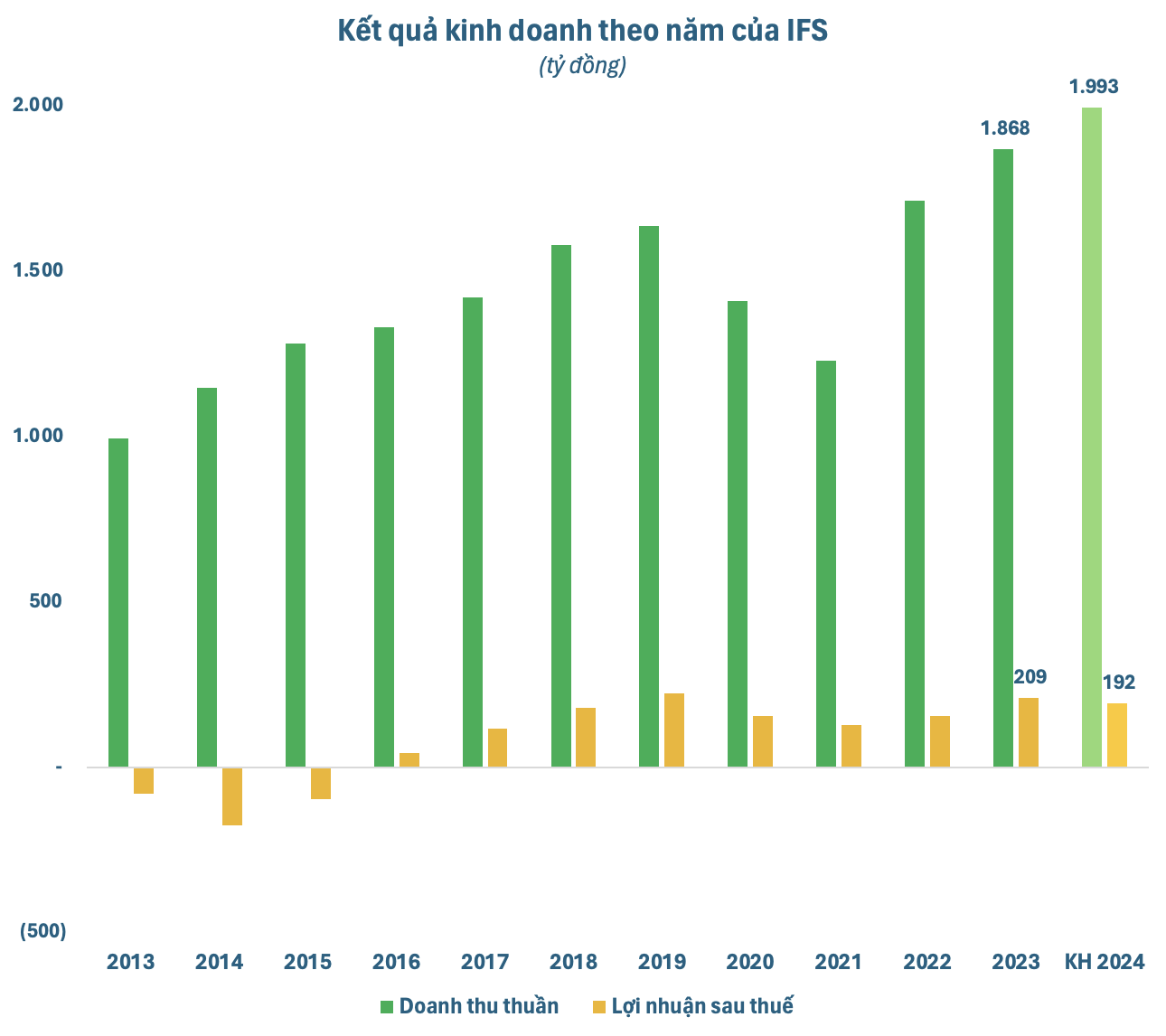 Bước sang năm 2024, IFS đặt mục tiêu doanh thu thuần đạt 1.993 tỷ đồng, tăng gần 7% so với thực hiện 2023 và là mức cao nhất từ khi hoạt động. Tuy nhiên, doanh nghiệp khá thận trọng với mục tiêu lợi nhuận khi lên kế hoạch lãi ròng chỉ khoảng 192 tỷ đồng, giảm 8% so với thực hiện năm 2023.