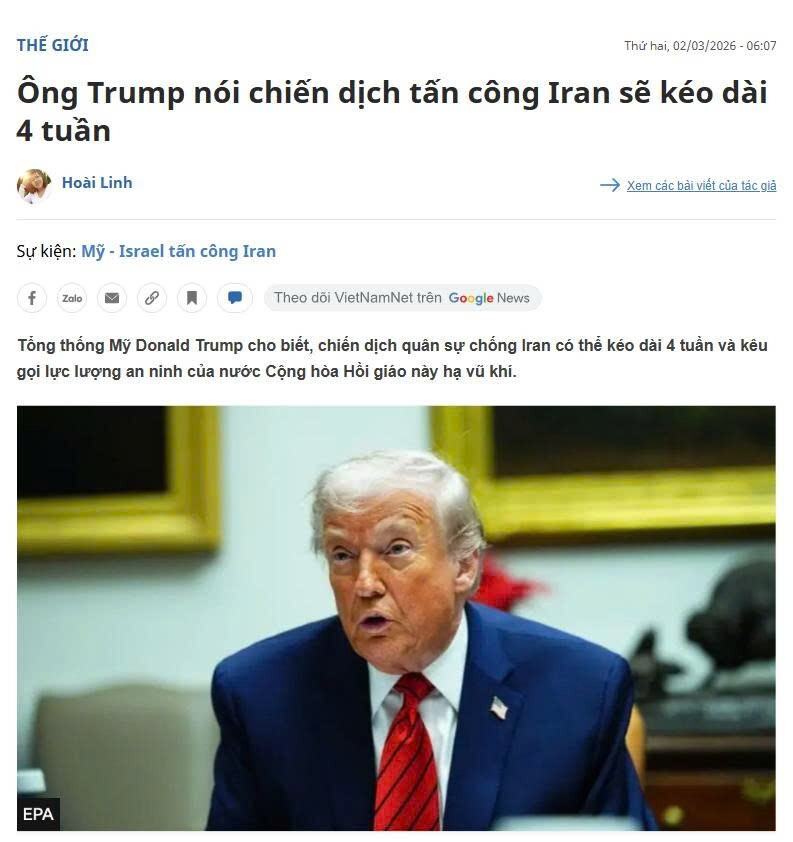 Tổng thống Mỹ Donald Trump cho biết chiến dịch quân sự của Mỹ, được thực hiện phối hợp với Israel, có thể kéo dài trong 4 tuần.