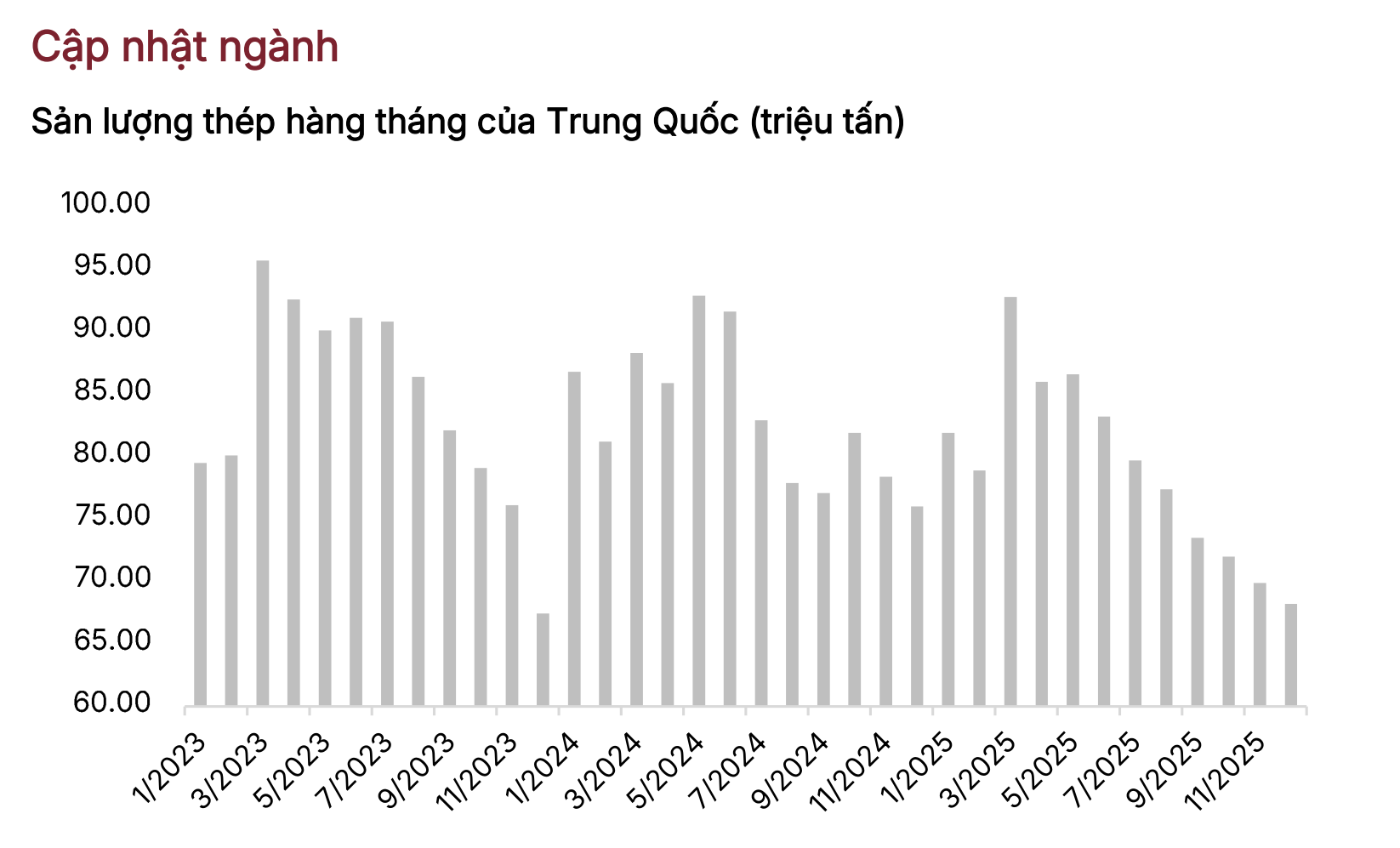 Tương tự, thị trường thép Trung Quốc cũng trải qua xu hướng giảm ban đầu rồi tăng trở lại vào tháng 11, đặc trưng bởi sự suy yếu của cả cung và cầu, nhưng sự sụt giảm rõ rệt hơn ở phía cung. Sau khi chạm đáy vào đầu tháng 11, giá thép biến động tăng trong tháng. Sự sụt giảm nhanh chóng trong sản lượng thép xây dựng vào tháng 11 là yếu tố chính làm giảm áp lực cung. Sản lượng thép thô từ 5 tỉnh sản xuất thép hàng đầu của Trung Quốc gồm Hà Bắc, Giang Tô, Sơn Đông, Liêu Ninh và Quảng Tây đã giảm 10.2% so với cùng kỳ năm ngoái trong tháng 11, xuống 34.46 triệu tấn, theo số liệu từ Cục Thống kê Quốc gia Trung Quốc (NBS).