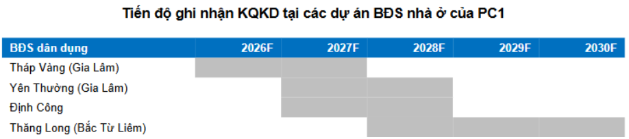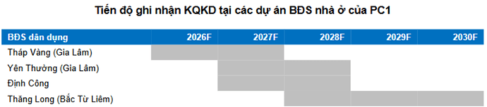 Cũng trong năm 2025, PC1 đã thoái vốn khỏi dự án BĐS Vĩnh Hưng, ghi nhận lợi nhuận 53 tỷ đồng. Các dự án BĐS nhà ở khác mà PC1 vẫn đang theo đuổi có thể kể đến: Yên Thường, Định Công, Thăng Long thì đều đang vướng mắc pháp lý. Các dự án này đều nằm trong quy hoạch, không vướng tranh chấp nên kỳ vọng sẽ được đẩy nhanh tiến độ xử lý trong thời gian 2027 – 2030.