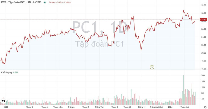 Trên thị trường chứng khoán, kết thúc ngày 1/3, thị giá cổ phiếu PC1 đạt 28.450 đồng/cổ phiếu.