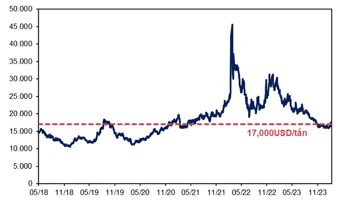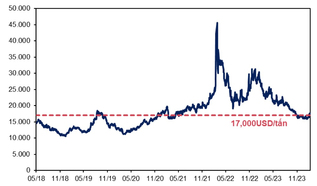 Diễn biến giá nickel trên thị trường thế giới (USD/tấn) trong 5 năm gần đây. (Nguồn: Bloomberg, MBS Research)