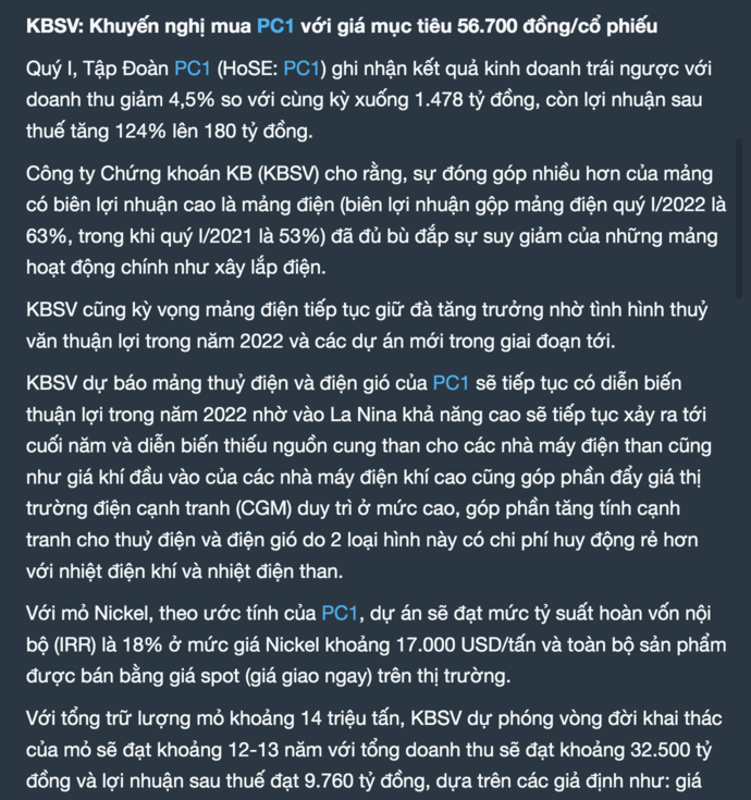 -Doanh thu mảng thuỷ điện của PC1 tăng tốc ngay từ đầu năm, sau 3 quý gặp bất lợi về thuỷ văn. Thủy điện (169 MW) ghi nhận 204 tỷ doanh thu (+80% yoy) nhờ thủy văn khả quan giúp sản lượng lên tới 98 triệu kWh (+121% yoy, ước tính cao hơn trung bình khoảng 47%), lợi nhuận gộp ước tính đạt 129 tỷ, tương ứng biên lợi nhuận gộp 63,4% (+10,3 đpt yoy). Với lượng mưa phủ sóng rộng khắp các tỉnh phía tây bắc, cùng với biểu giá tránh được cho các thuỷ điện nhỏ dưới 30MW, giá bán điện của các thuỷ điện mà PC1 sở hữu ở mức rất cao, 2.081,6 đồng/kWh. Những tháng cao điểm hè 2022, nhóm thuỷ điện mà đặc biệt là PC1 sẽ được hưởng lợi một cách chắc chắn và nhiều khả năng biên gộp sẽ còn tiêp tục được cải thiện. Doanh thu từ riêng thuỷ điện có thể đóng góp vượt 1.000 tỷ đồng trong 2022, mang về quanh 650 tỷ đồng LNG -Điện gió (144 MW): ghi nhận 253 tỷ doanh thu với sản lượng đạt 129 triệu kWh nhờ tình hình gió thuận lợi ở miền trung (ước tính vượt thiết kế khoảng 5%), lợi nhuận gộp ước tính đạt 157 tỷ, tương ứng biên lợi nhuận gộp 62%. Điện gió của PC1 với 144 MW đã được hưởng giá FIT sau khi về đích thành công. Đây là 3 trang trại điện gió lớn đang được huy động công suất nguồn trên hàng ngàn MW điện gió chưa thể về đích và chưa chốt được cơ chế giá sau ngày 31/10/2021. Lợi thế này đến từ chính PC1, là đơn vị tiên phong trong tổng thầu EPC trong lĩnh vực xây lắp điện gió trên bờ, cũng như đồng hành cùng EVN và đối tác NPT trong xây dựng đường dây truyền tải điện quốc gia.