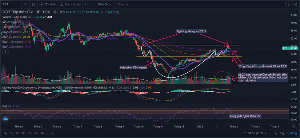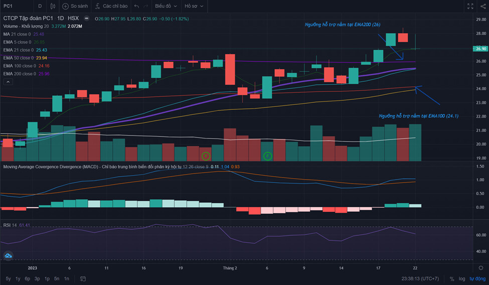 Xét về chart ngày với các đường EMA và MA. EMA5 và đường giá đã vượt EMA200 với lượng vol cao trong phiên 17/02 và 20/02, trùng với ngưỡng hỗ trợ gần nhất (26). PC1 còn vùng hỗ trợ cứng hơn ở 24.1 (EMA100) tuy nhiên PC1 khó có thể về vùng này bởi đã hoàn thành mẫu hình VĐV ngược và kiểm định thành công vai phải khi bật tăng từ mức 26 (EMA200) trong phiên hôm nay.
