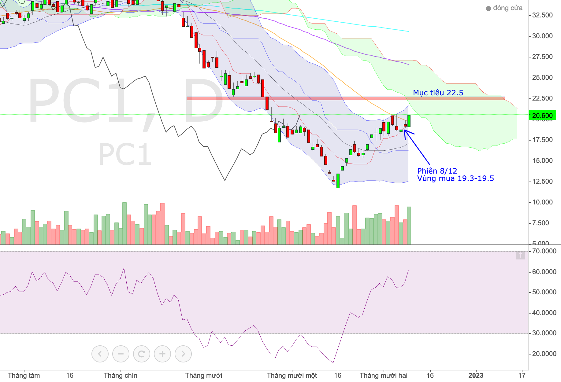 PC1 sau khi hồi phục từ vùng đáy 12 đã có quá trình tăng điểm khá mạnh mẽ, đây là dạng cổ phiếu khó canh điểm vào nếu mua trật nhịp đầu tiên. Vào những phiên rung lắc vừa qua xuất hiện cơ hội vào lại dành cho những NĐT lỡ nhịp như vậy.