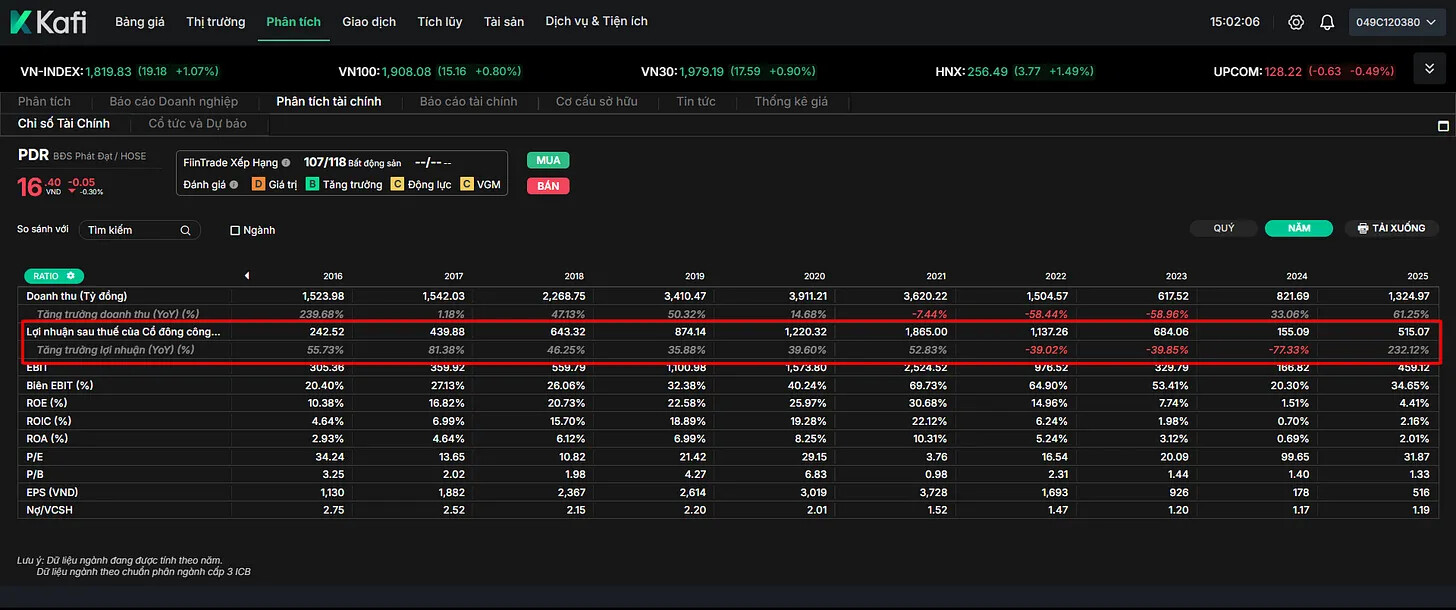 Năm 2025, lợi nhuận sau thuế hợp nhất đã kiểm toán của PDR đạt gần 515 tỷ đồng , tăng 232% so với năm trước. Đây là mức tăng trưởng nền khá mạnh, tạo cơ sở cho kế hoạch 2026.