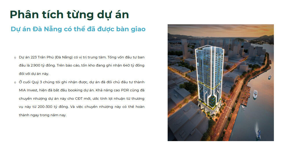 Và thứ hai, chưa thấy ghi nhận dự án Thuận An 1. Vừa có thông tin chuyển nhượng vốn công ty con cuối tháng 10, thế nên khả năng cao con số 2000-2500 tỷ này sẽ rơi vào Quý 4. Đồng thời cũng chưa thấy chuyển nhượng dự án 223 Đà Nẵng sau nhiều tin đồn.