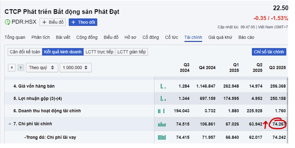 Một điểm đáng để ý đối với PDR đó là chi phí lãi vay, con số này liên tục giảm trong 3 năm tính từ khủng hoảng trái phiếu. Nhưng hiện tại Quý 3 đánh dấu thời điểm đã có dấu hiệu tăng trở lại.