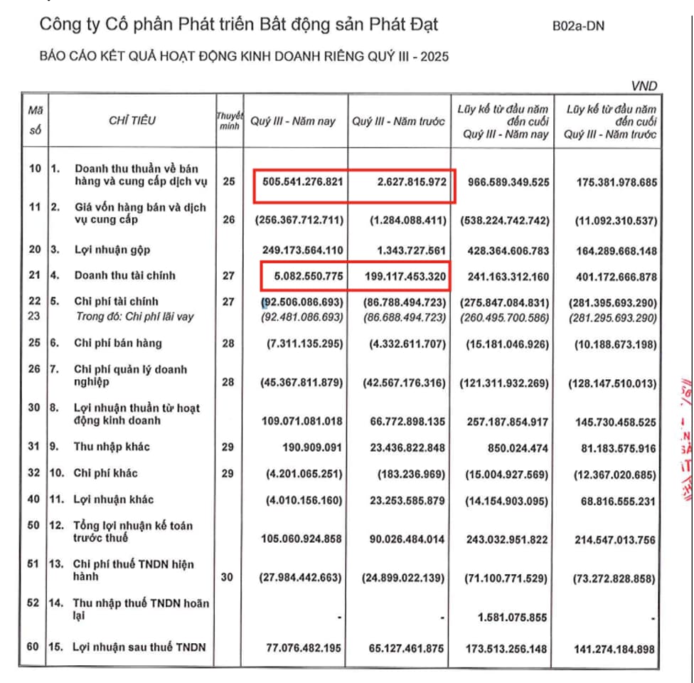 Tổng lợi nhuận kế toán trước thuế của Phát Đạt Quý III năm nay là 105 tỉ, so với quý III năm ngoái là 90 tỉ
