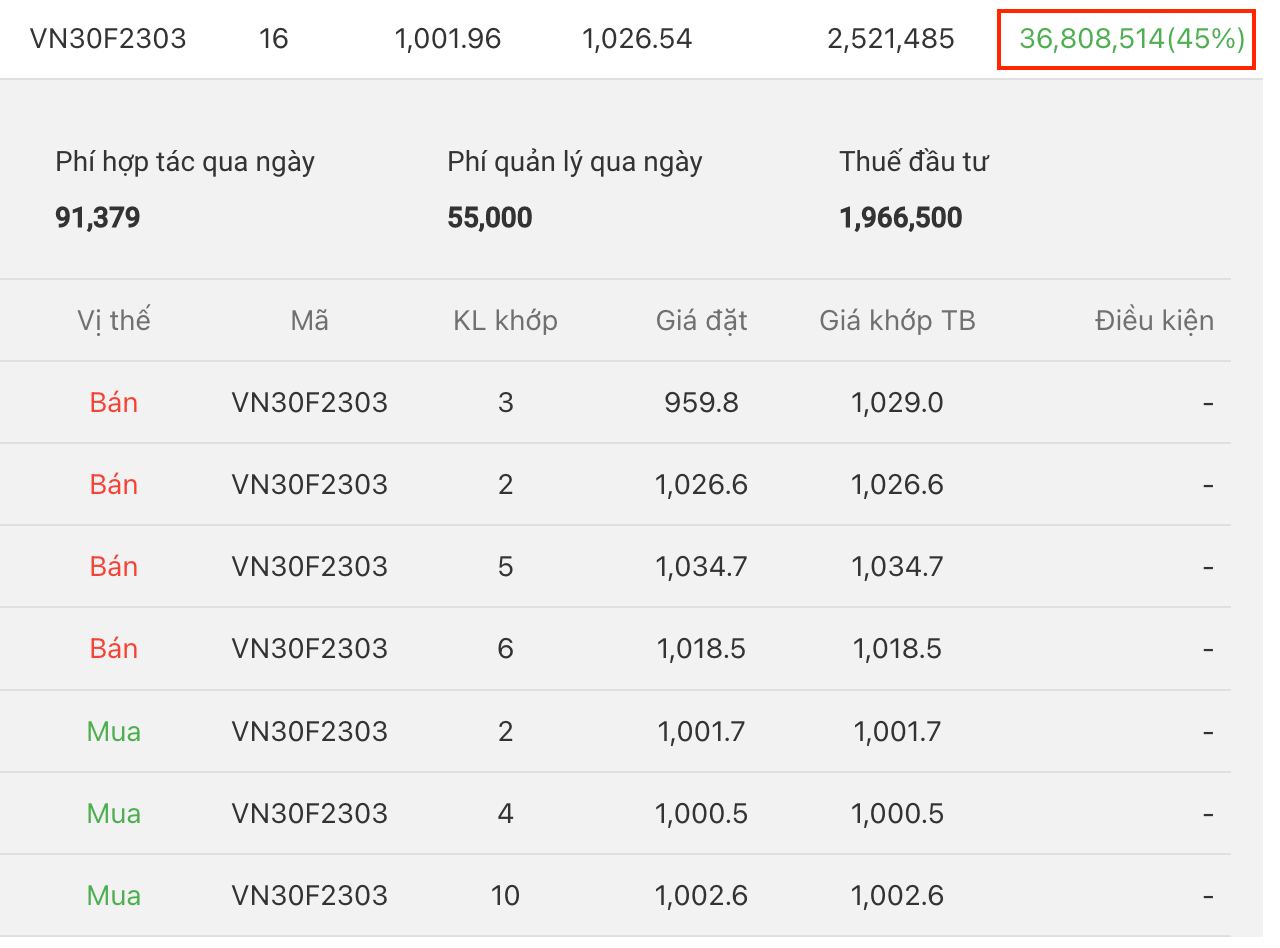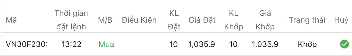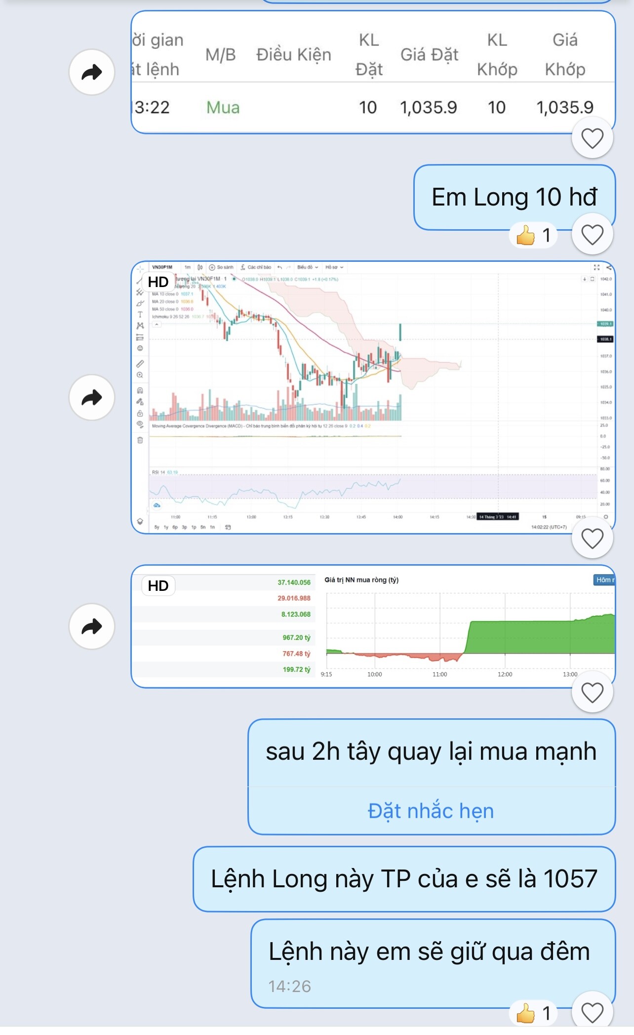 mình đăng bài này lên nhằm mục đích giới thiệu với mọi người về phái sinh chỉ khuyên mọi người bỏ 1 phần nhỏ hoặc khi thấy thị trường rủi ro vẫn có thể kiếm được tiền và cũng muốn có thể giao lưu với mọi người cũng đang đầu tư phái sinh, rất mong được nghe quan điểm của mọi người về xu hướng những phiên tới, nay mình có để 10 Hợp đồng Long lúc 13h22 ở 1035.9 và quyết định sẽ giữ qua đêm với kỳ vọng sẽ đạt target mình đề ra là sẽ chốt. Mọi người có thể kết bạn giao lưu với mình, tin tưởng mình sẽ tặng mọi người lệnh phái sinh và sẽ take care luôn, khi mình cảm thấy tỷ lệ rủi ro thấp an toàn sẽ có những ngày mình nghỉ những lệnh này hoàn toàn miễn phí mọi người có thể để thị trường kiểm chứng, sau mỗi phiên mình cũng sẽ cập nhật tài khoản mẫu này và những lệnh mình đi, chúc mọi người đầu tư hiệu quả.