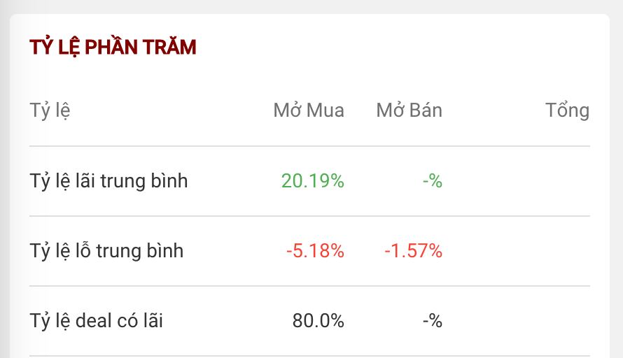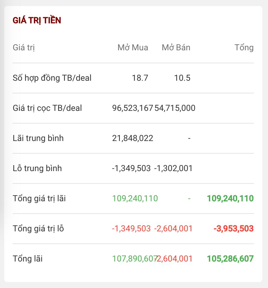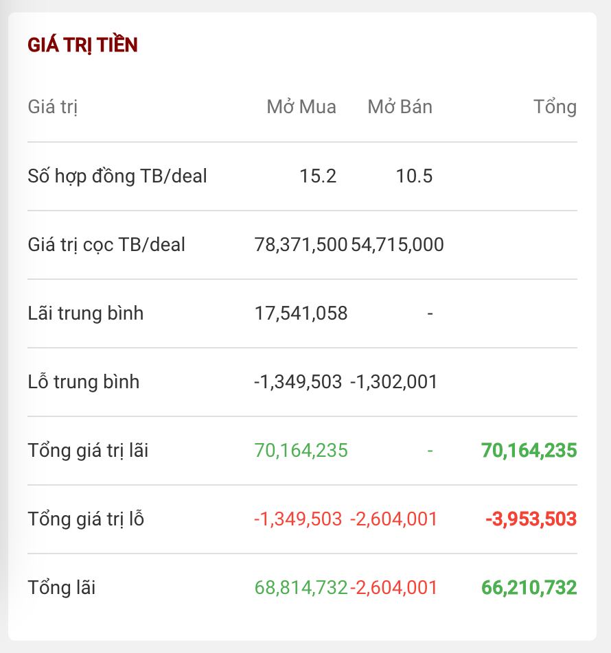 - Mọi người có thể xem ảnh tổng lợi nhuận thực tế của mình rất cao đạt 70 triệu đồng trong khi tổng giá trị lỗ là gần 4 triệu đồng. Deal lợi nhuận cao nhất lên tới 45% mình chỉ đánh 1 chiều/ngày 1-2 lệnh . Mọi người có thể xem qua danh sách một số Deal Lãi/Lỗ tỷ lệ lãi so với lỗ rất lớn do mình SL cực kì chặt chẽ và không đi lệnh tràn lan theo cảm tính, mọi người có thể xem qua ảnh mình gắn ở bài viết và comment