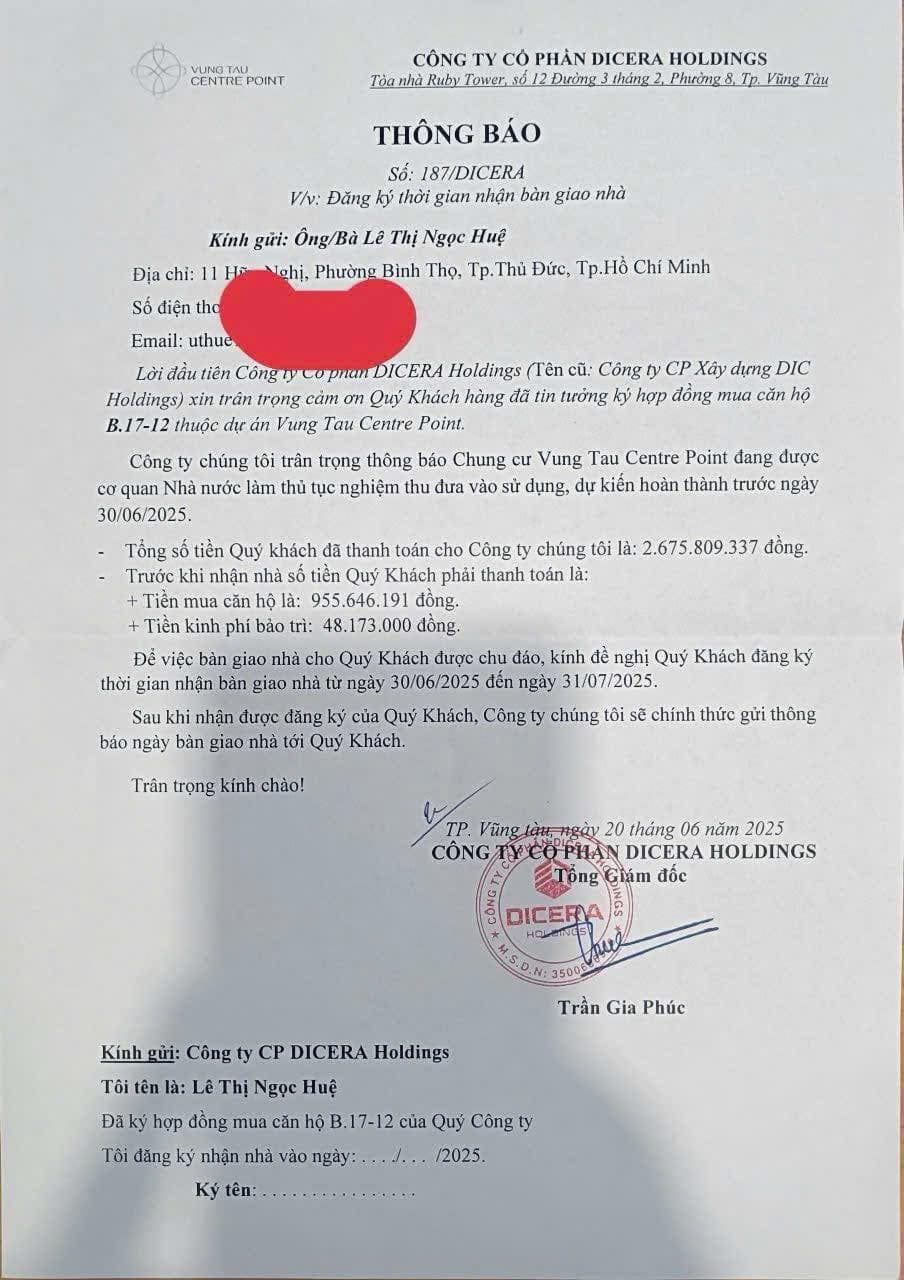Các bác nhận được Thông báo Nhận bàn giao Căn hộ chưa?