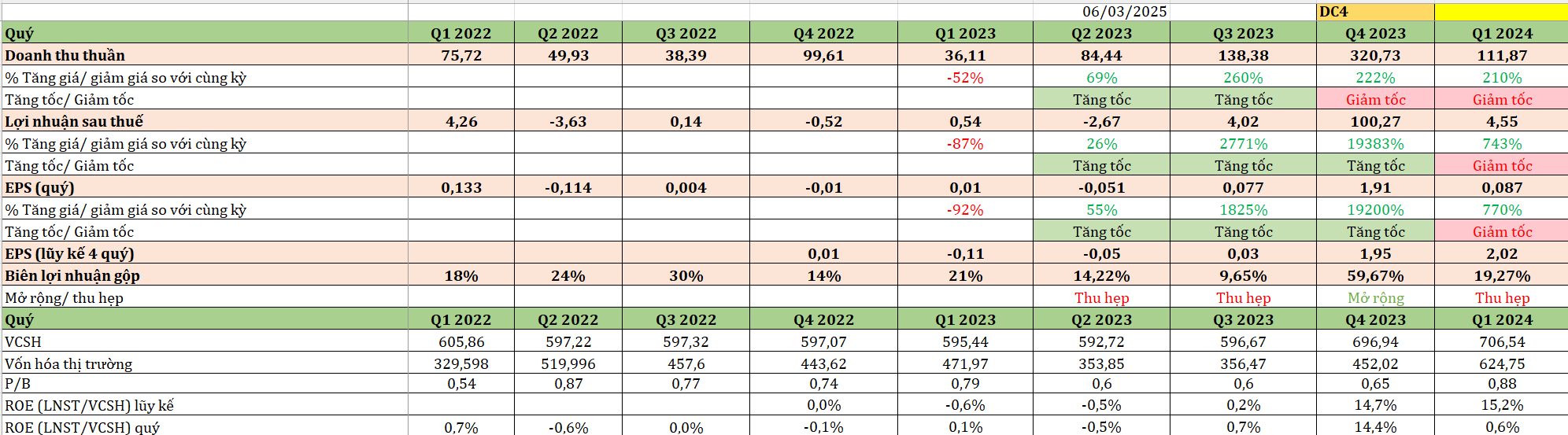 Còn từ Q2/2024 đến giờ lợi nhuận từ mảng xây lắp và biên lợi nhuận đột biến ==> Do DC4 ký hợp đồng thầu EPC với DIG để hợp thức hóa. Còn về kết quả kinh doanh quý 1/2025 còn khoảng 400 tỷ doanh thu xây lắp VTCP trên tông 1400 tỷ chưa hạch toán ==> Nên ước tính được lợi nhuận quý 1/2025