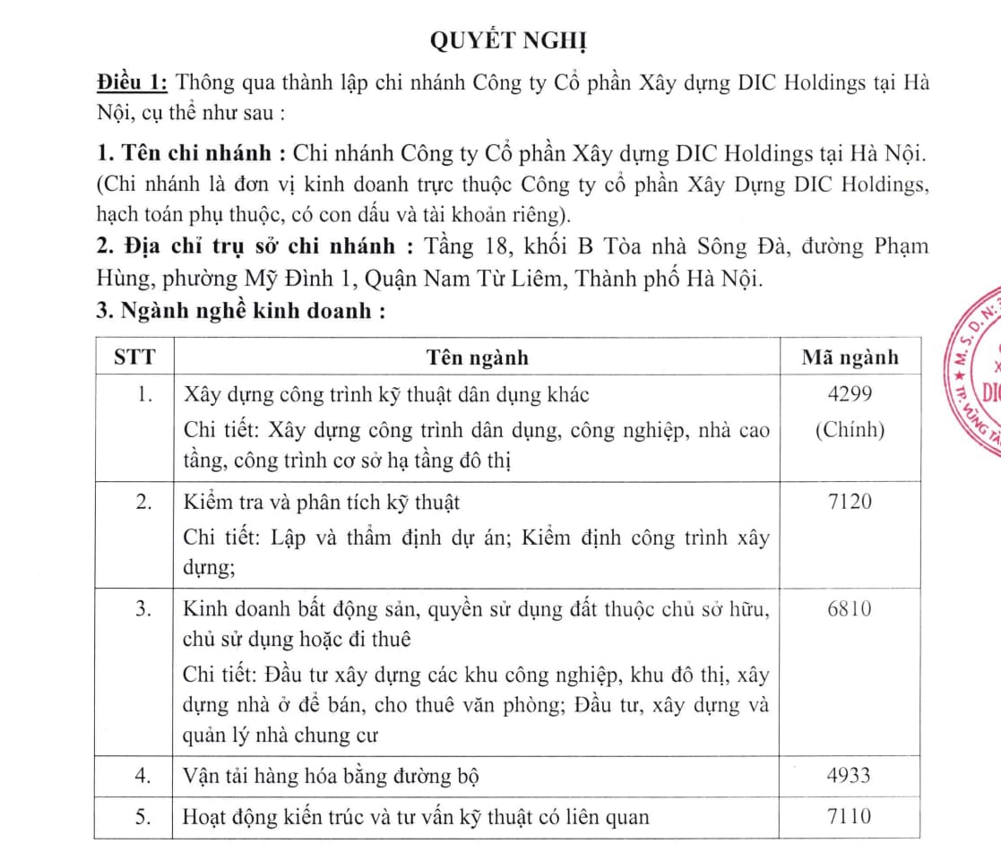Trong một diễn biến khác, mới đây DIC Holdings vừa công bố Nghị quyết về việc thông qua thành lập Chi nhánh Công ty Cổ phần Xây dựng DIC Holdings tại Hà Nội.