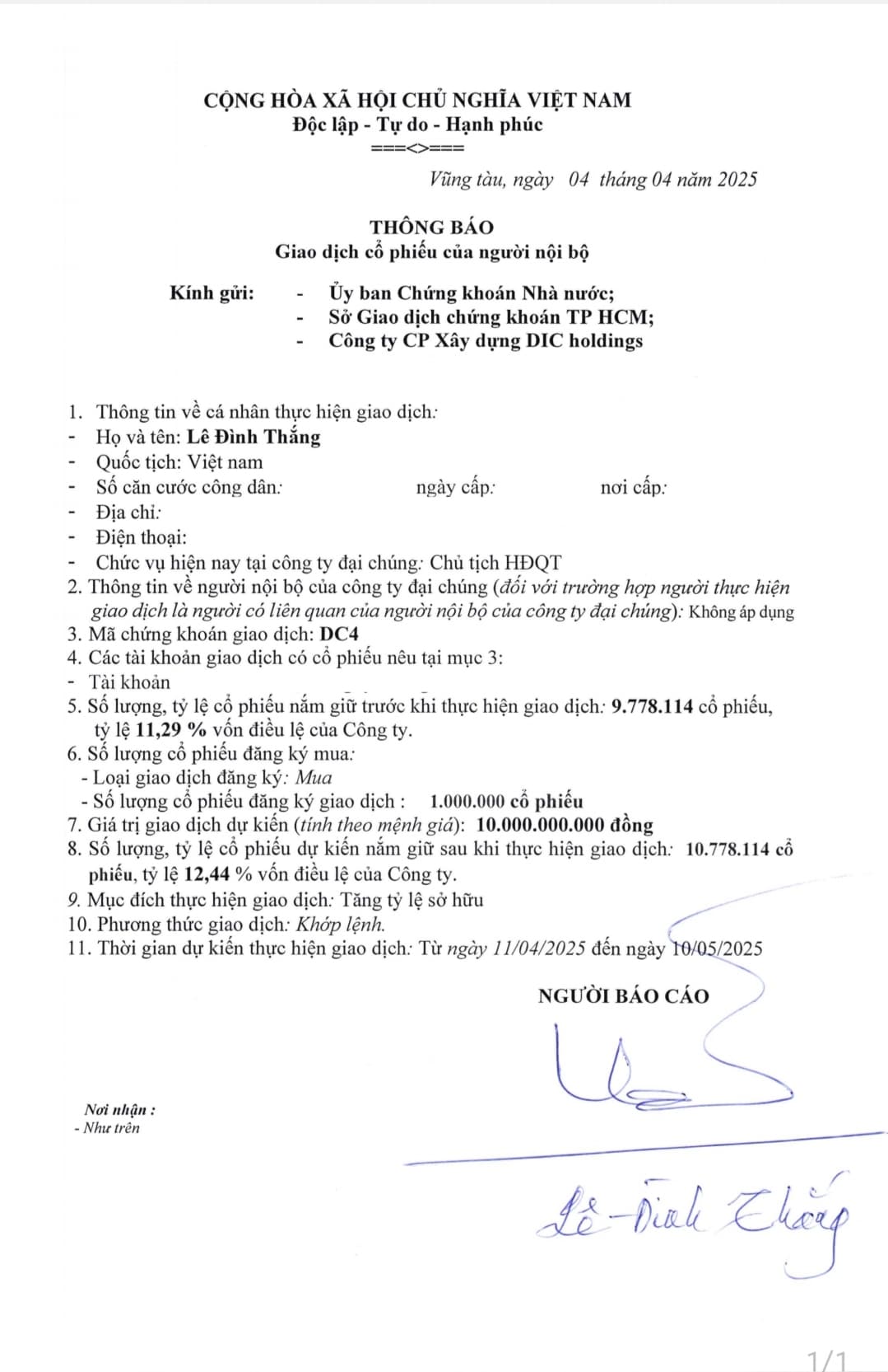 Cổ phiếu Công ty Cổ phần Xây dựng DIC Holdings