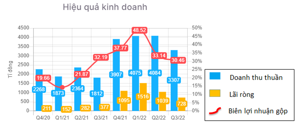 Cụ thể, doanh thu quý 3 đạt 3,307 tỷ, tăng 1.82 lần so với cùng kỳ nhưng giảm 19% so với đầu năm, lãi ròng quý 3 đạt 728 tỷ, tăng 2.16 so với cùng kỳ nhưng giảm 52% so với đầu năm.