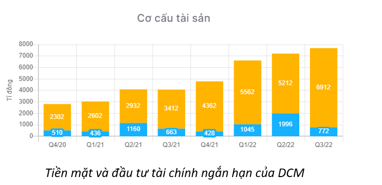 DCM là doanh nghiệp có cơ cấu tài chính với tổng tiền mặt và tiền gửi lên tới 7,684 tỷ đồng (chiếm 60% cơ cấu tài sản) và đặc biệt là doanh nghiệp gần như không có nợ vay. Điều này chứng tỏ sức khỏe tài chính của doanh nghiệp rất tốt, doang nghiệp sẽ có thêm dòng tiền từ doanh thu tài chính trong bối cảnh lãi suất ngân hàng tăng cao.