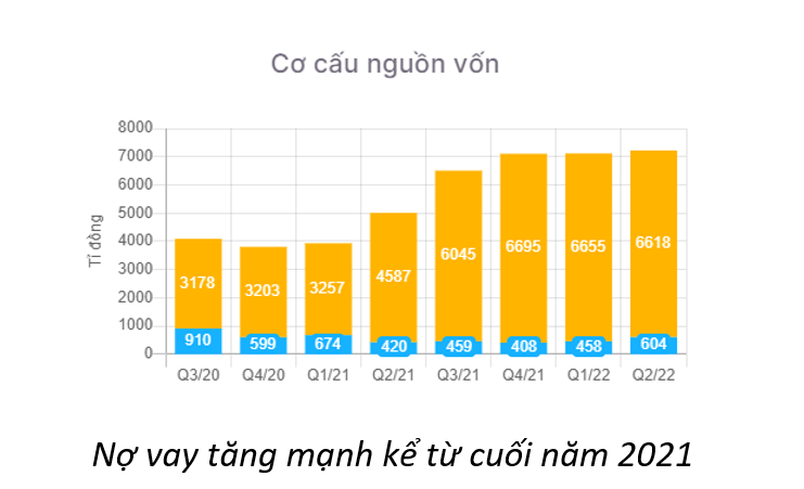 - Doanh nghiệp vay nợ nhiều dẫn đến chi phí lãi vay tăng cao: Ở quý 2/2022, lợi nhuận ghi nhận 186 tỷ, trong khi đó, chi phí lãi vay chiếm 147 tỷ, điều này làm ảnh hưởng lớn tới kết quả kinh doanh của doanh nghiệp.