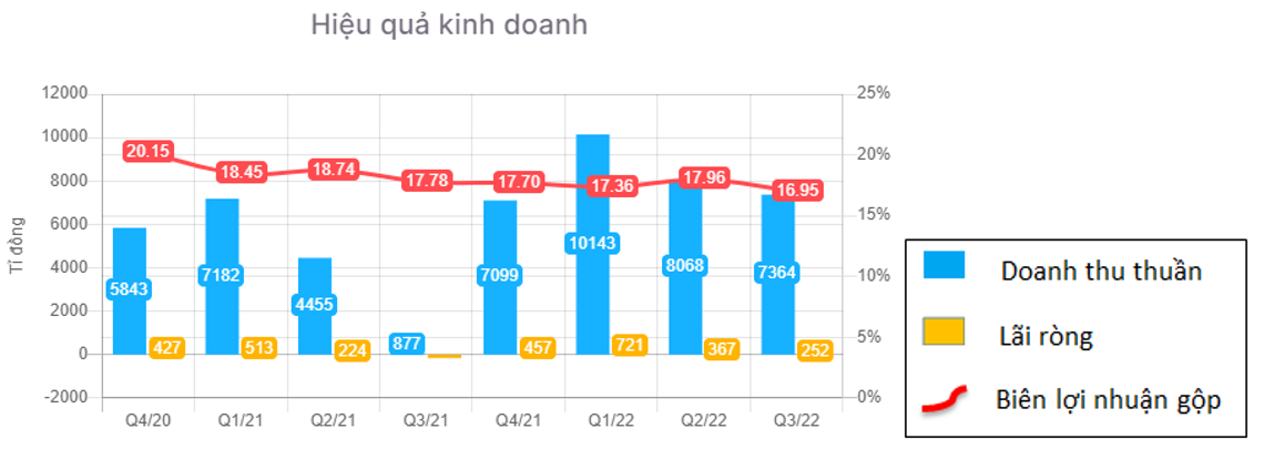 Doanh thu thuần Q3/2022 của PNJ tăng trưởng ấn tượng 840% do mức nền thấp Q3/2021, tuy nhiên, mức doanh thu này giảm 8.7% so với quý trước do hiện tại cũng là quý thấp điểm của PNJ. Lãi ròng ghi nhận đạt 252 tỷ đồng, tăng trưởng rất mạnh so với cùng kỳ, nhưng cũng bị giảm 31% so với quý trước đó.