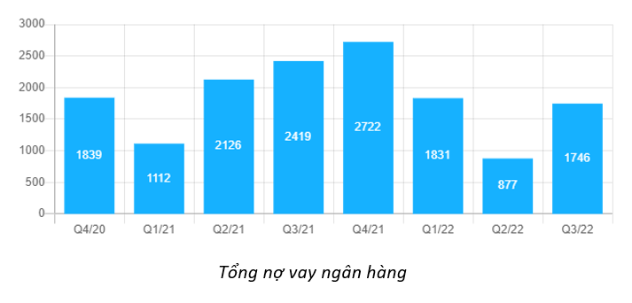 - Tổng nợ vay ngân hàng của PNJ ghi nhận 1,746 tỷ tại thời điểm quý 3, mặc dù con số này tăng gấp đôi so với quý 2/2022 nhưng cũng chiếm trọng số rất nhỏ trong cơ cấu nguồn vốn.
