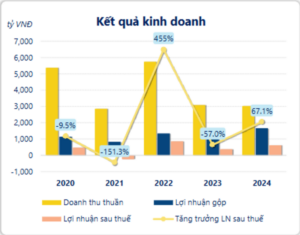 Biểu đồ kết quả kinh doanh của CII giai đoạn 2020–2024. Doanh thu ổn định quanh 3–6 nghìn tỷ, lợi nhuận dao động do thay đổi tiến độ dự án (Nguồn: Dữ liệu CII từ VNSC)